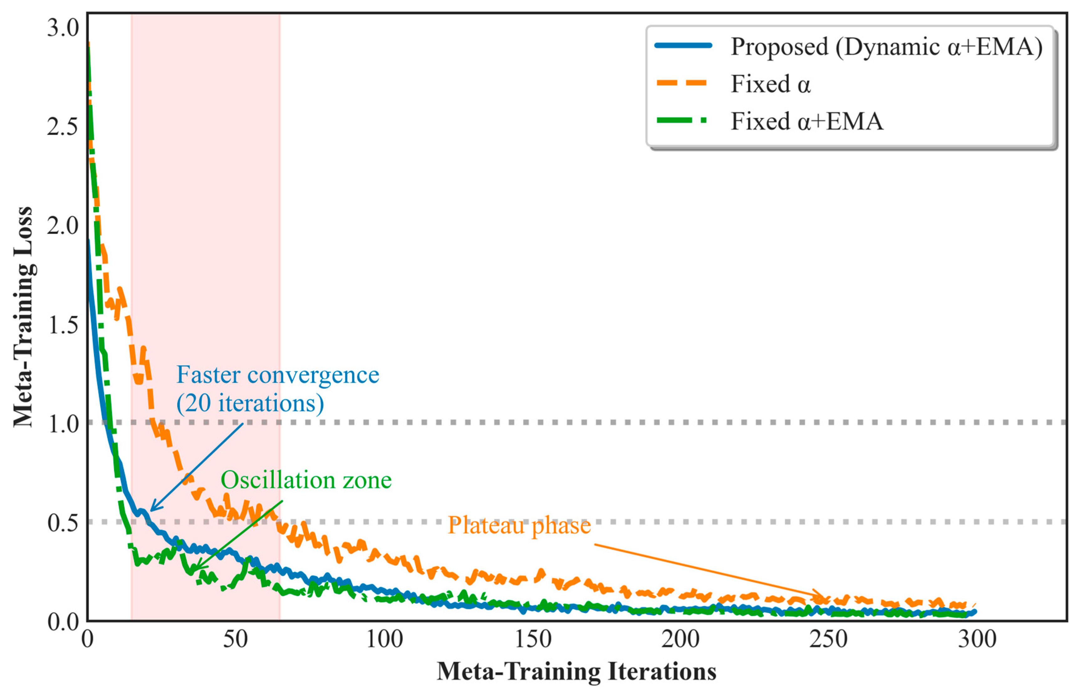 Notably, the fixed + EMA method exhibits noticeable loss fluctuations and oscillations between 15 and 65 iterations (red region), reflecting instability in the optimization process due to task conflicts, which limits the model’s rapid convergence early on. In contrast, the model using a fixed (orange line) did not exhibit oscillations but reached a plateau after 200 iterations, with the loss value stabilizing around 0.3 and failing to decrease further. This suggests that a fixed learning rate lacks an effective adjustment mechanism, preventing optimization in the later stages of training.