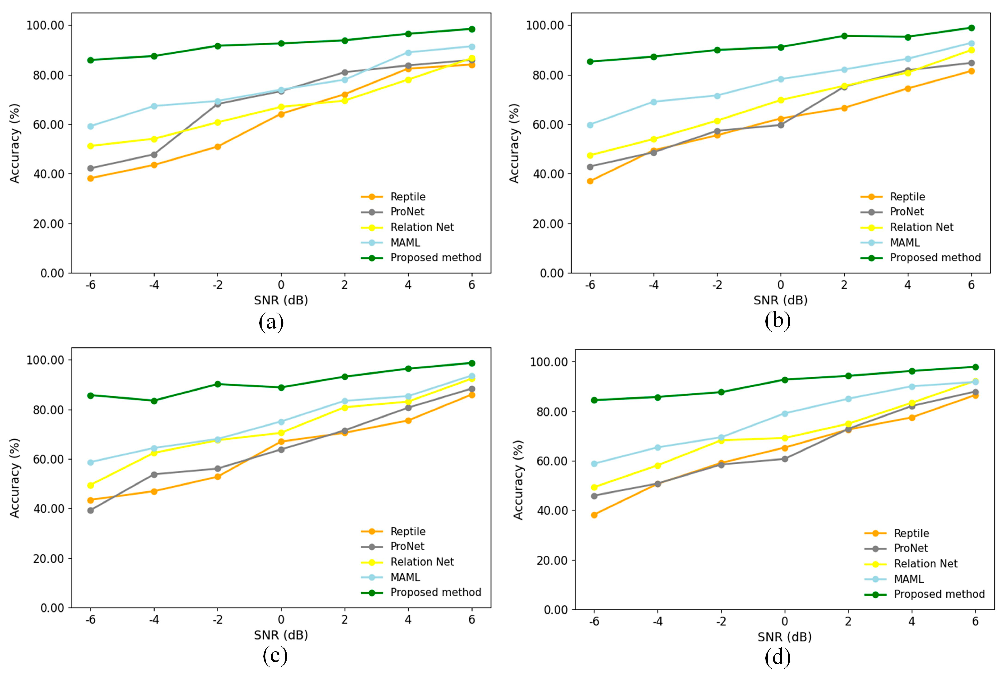In the experiments, the diagnostic accuracy of the proposed method is compared and analyzed with four classical methods, namely, Reptile, ProNet, RelationNet, and MAML, in multiple cross-domain scenarios using different signal-to-noise ratios (SNRs) from −6 dB to 6 dB. The experimental results are shown in