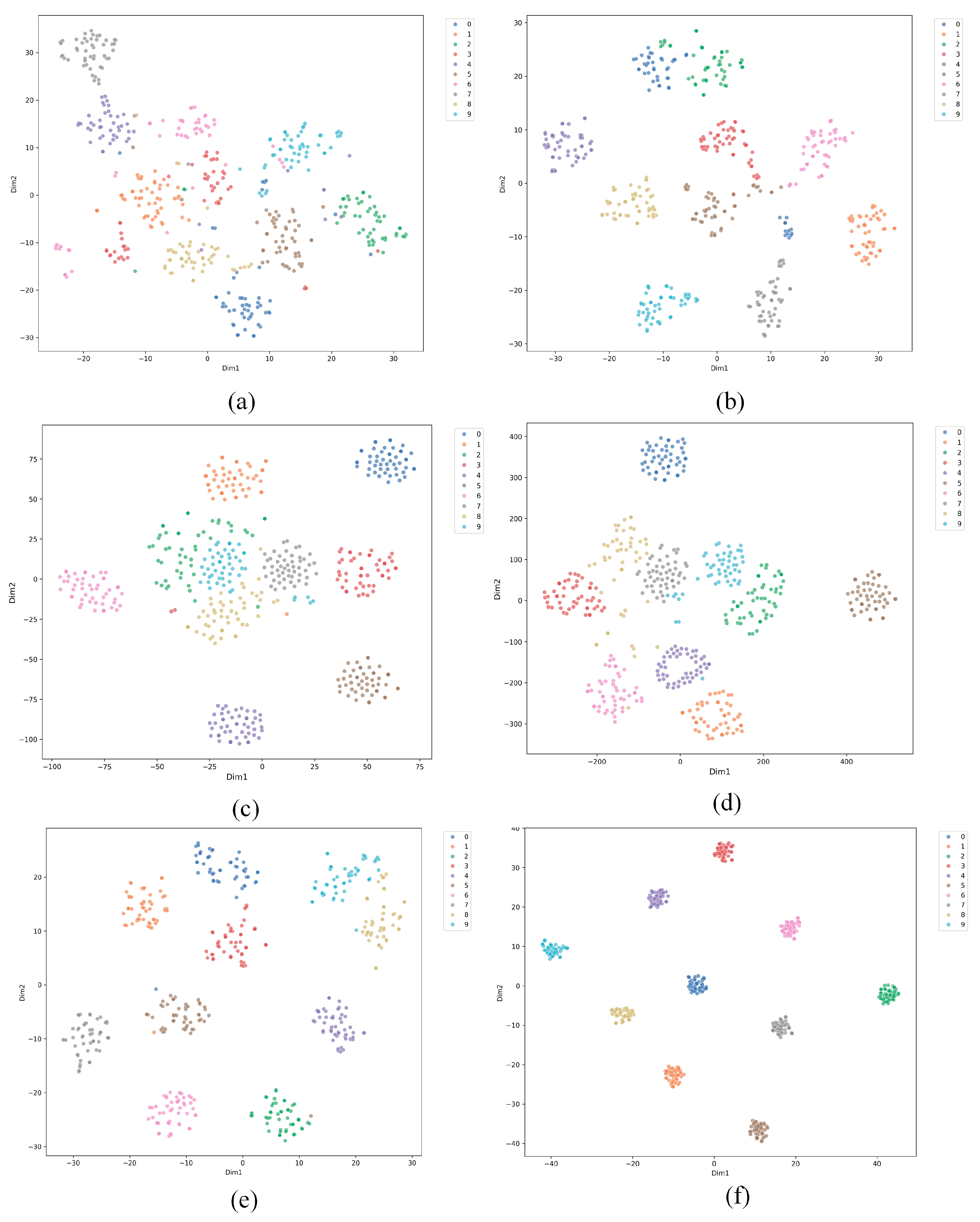 Figure 12 presents the t-SNE results for six methods applied to small-sample cross-domain fault diagnosis of bearings. Each sub-figure shows a different method with data points colored by class. (a) shows the results for SVM, with widely spread data points and some class overlap, indicating difficulty in handling the task. (b) shows the results for Reptile, with more distinct clusters but still some class mixing, suggesting better performance than SVM but challenges with small samples. (c) and (d) show the results for Prototypical Networks (ProtoNet) and Relation Networks (RelationNet), both showing more compact clusters and reduced overlap, though some intersections remain. (e) shows the results for MAML, with better separation and less overlap, indicating strong adaptability to small-sample cross-domain tasks. (f) shows the results for the proposed method, which achieves the best clustering with minimal overlap, demonstrating superior performance in handling small-sample cross-domain fault diagnosis. Overall, while traditional methods such as SVM struggle with class separation, newer meta-learning approaches, especially the proposed method, significantly improve the handling of small-sample cross-domain tasks.