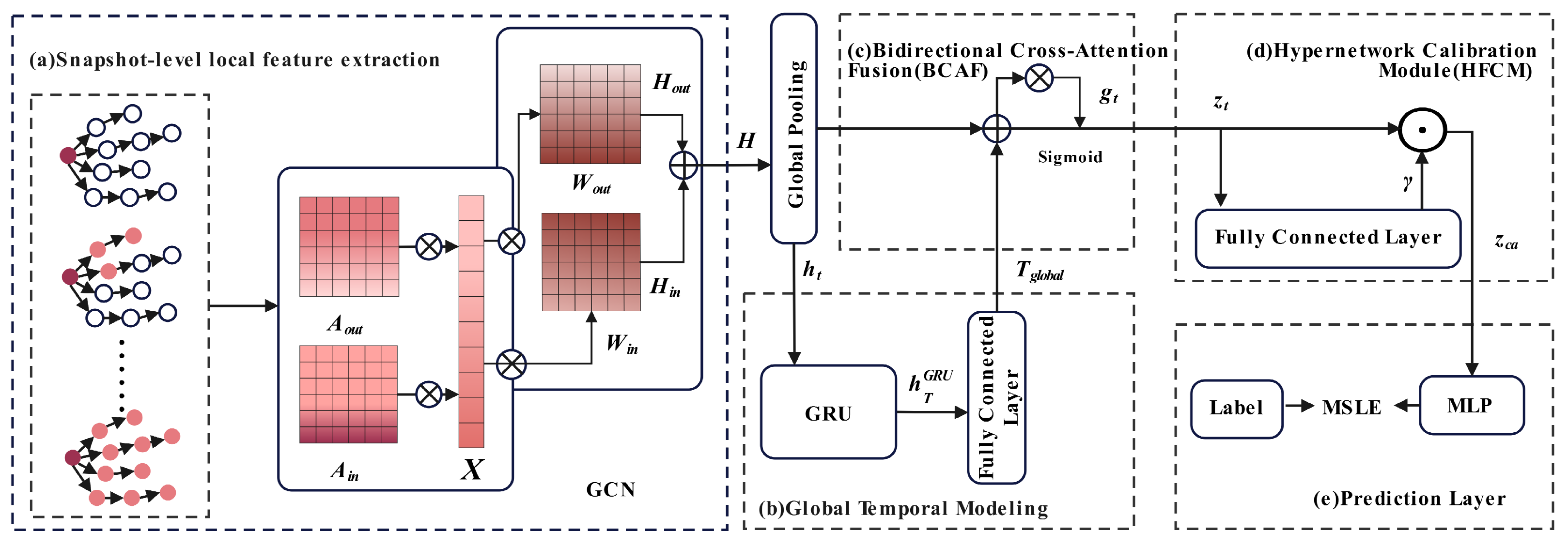 - We propose CasDacGCN, a dynamic attention-calibrated graph convolutional network for information popularity prediction. Our model introduces the Bidirectional Cross-Attention Fusion (BCAF) module, which dynamically integrates snapshot-level local structural features with global temporal context, mitigating the decoupling of spatial and temporal signals, and thereby better capturing the evolution of information cascades.