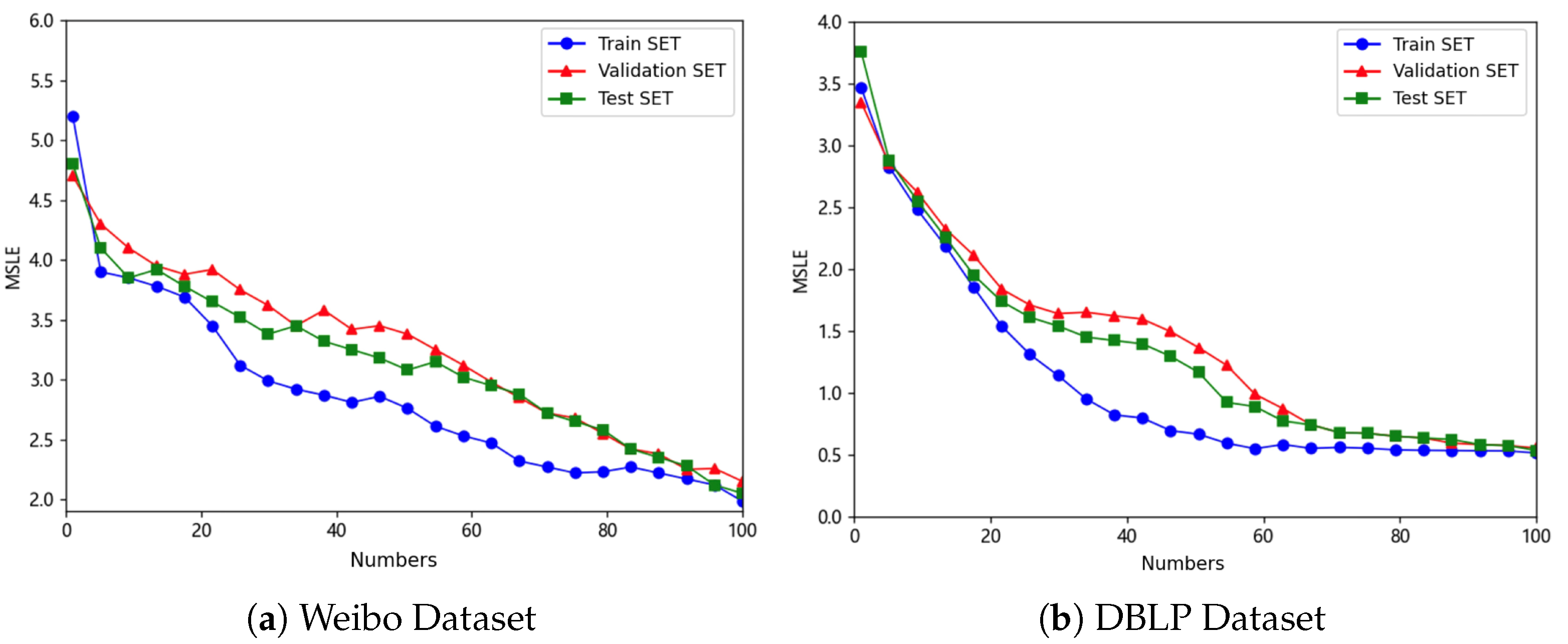 - Jiao, P.; Song, W.; Wang, Y.; Zhang, W.; Chen, H.; Zhao, Z.; Wu, J. Cascade Popularity Prediction: A Multi-View Learning Approach with Socialized Modeling. IEEE Trans. Netw. Sci. Eng. 2025, 12, 1198–1209. [Google Scholar] [CrossRef]