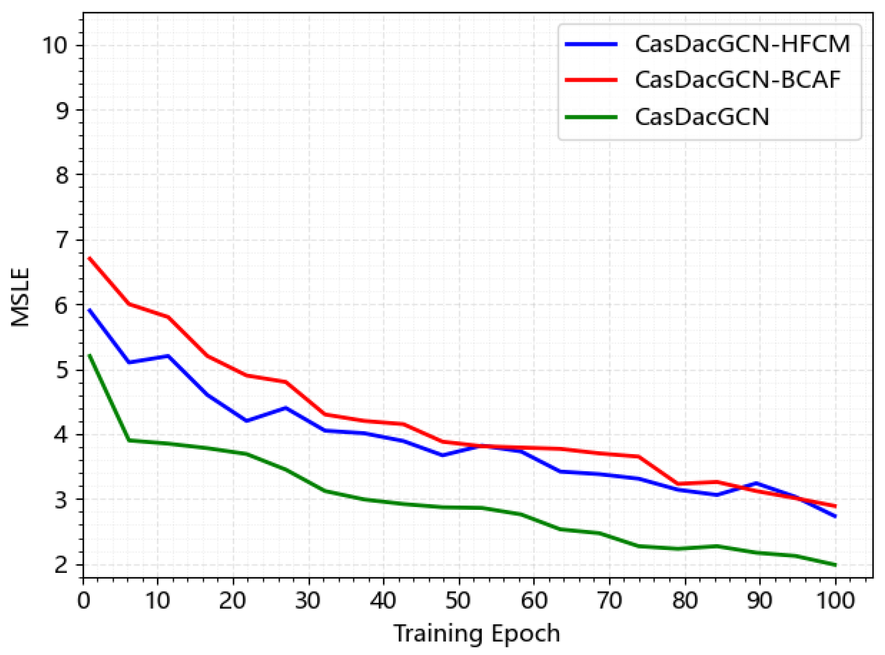 - Experimental results on the Weibo and DBLP datasets validate the effectiveness of our approach, demonstrating that the CasDacGCN model outperforms existing baseline methods in information propagation prediction tasks. Ablation studies further confirm the critical roles of the Bidirectional Cross-Attention Fusion (BCAF) and Hypernetwork Calibration (HFCM) modules in improving model performance.