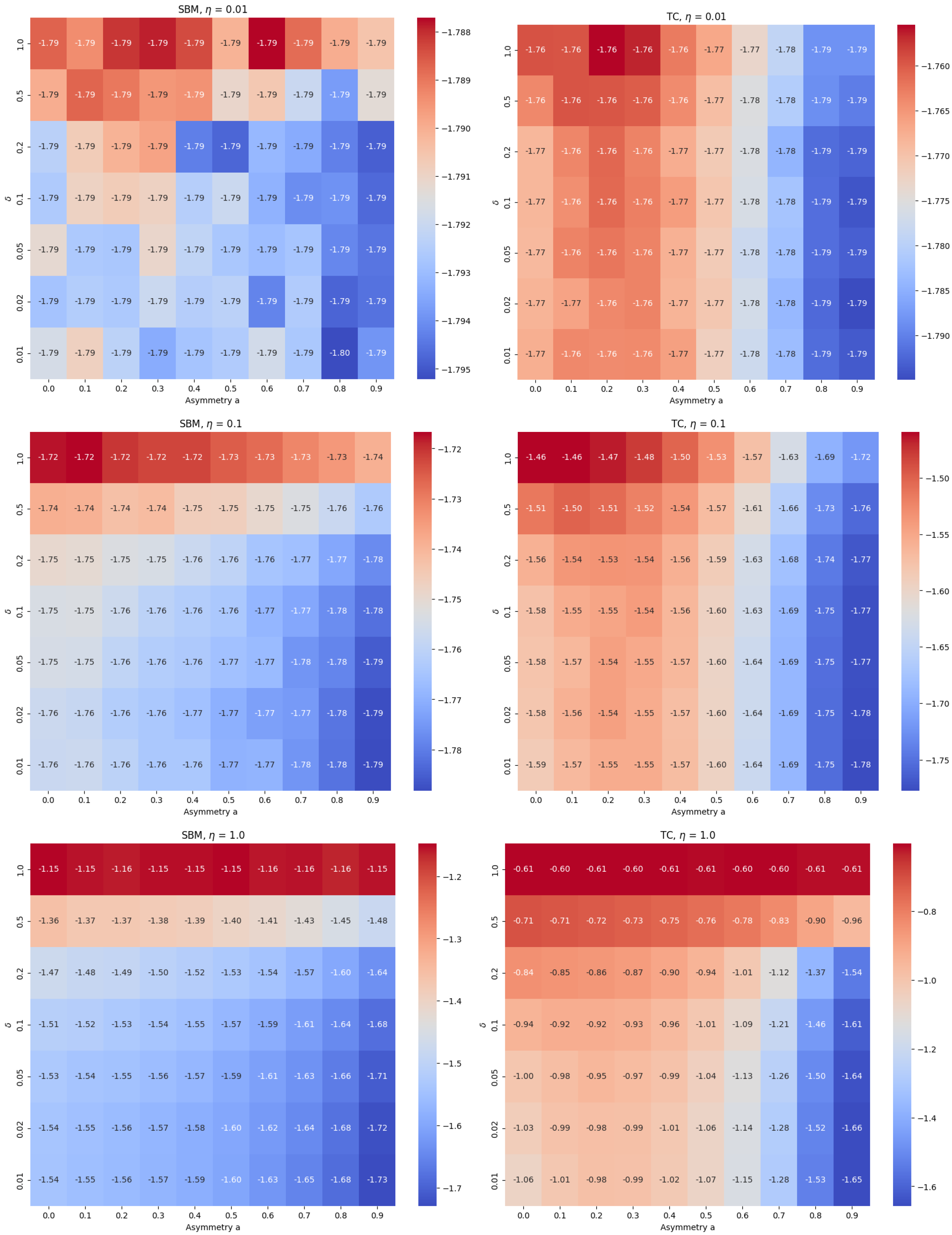 To account for randomness in both the network generation and the initial conditions, we conduct 1000 independent simulations for each parameter configuration. In every run a new network is generated according to the selected model (SBM or TC) and asymmetry level a.
