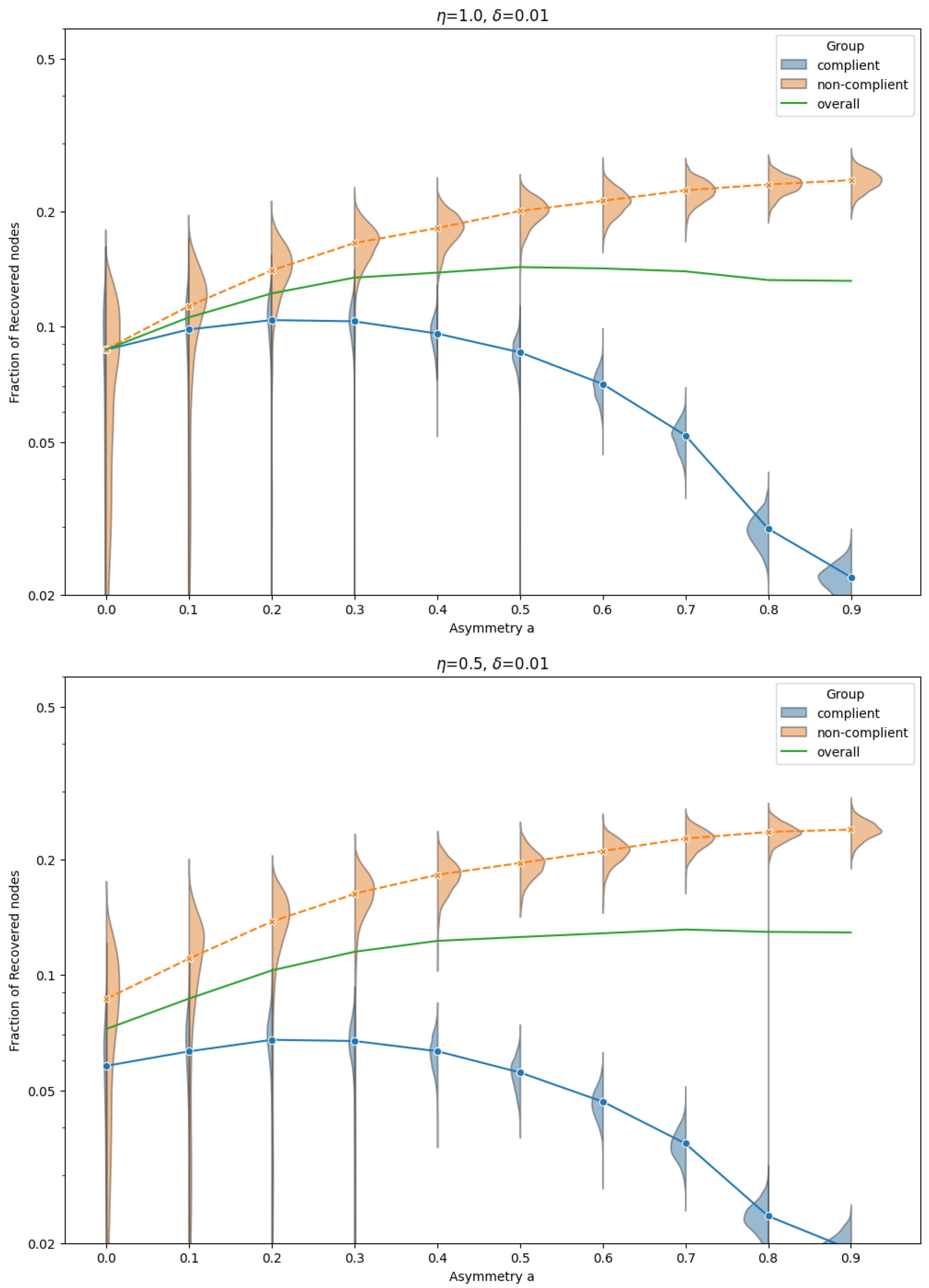 By contrast, in the non-compliant group, the fraction of recovered nodes increases monotonically with homophily: as separation strengthens, their denser internal connectivity facilitates more efficient spread.