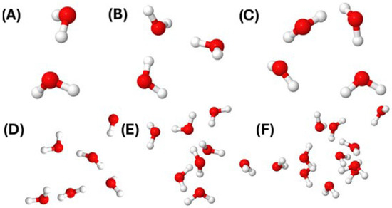 Representative water clusters identified using the Sevick method during molecular dynamics simulations at 298.15 K and 1 bar. The clusters shown contain (A) 2 molecules, (B) 3 molecules, (C) 4 molecules, (D) 5 molecules, (E) 7 molecules, and (F) 11 molecules. Oxygen atoms are colored red and hydrogen atoms are white. The progression from small to large clusters illustrates the development of increasingly complex hydrogen bonding networks, with larger clusters beginning to exhibit bulk-like structural features.