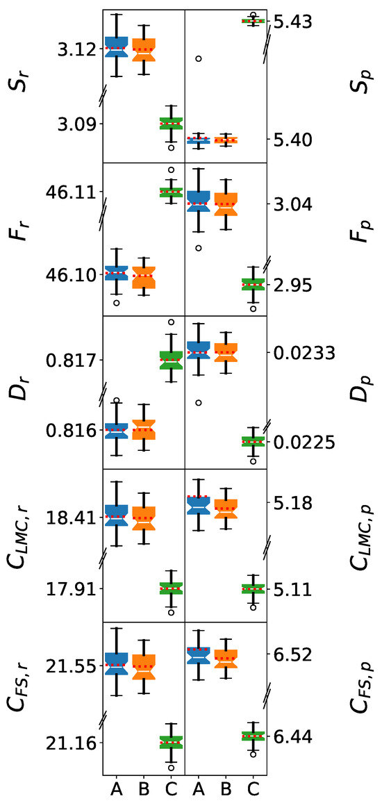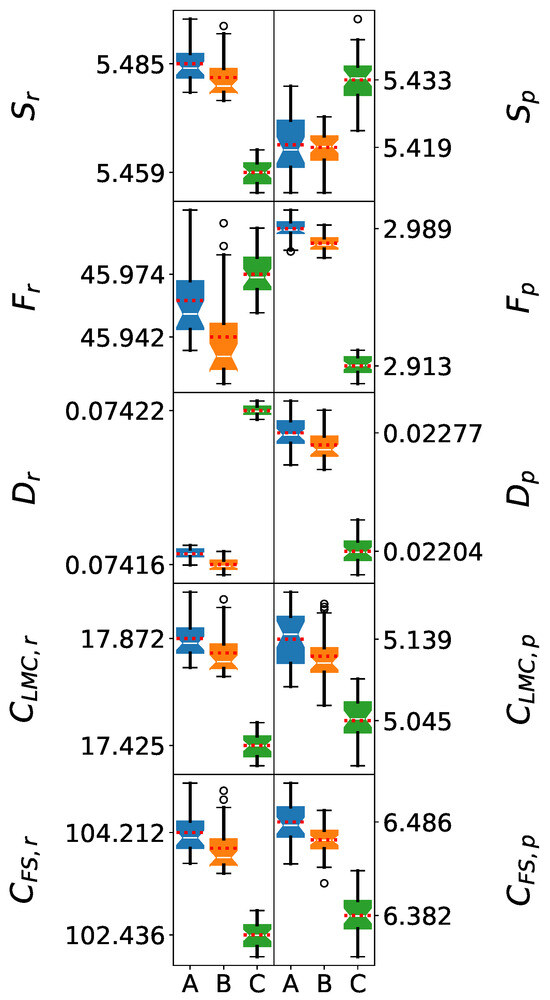 In contrast, all the information-theoretic measures’ distributions in momentum space are normal. All p-values for the Shapiro–Wilk tests are higher than 0.05, and the values for the probability plots were higher than 0.96, with the exception of with the SPC/ force field. This can be observed in Figure 4, where all the box plots are symmetric and the mean values are close to the medians, except for the aforementioned metric and force field. Therefore, the information-theoretic measures in momentum space are unaffected by the inhomogeneities of the clusters in position space.