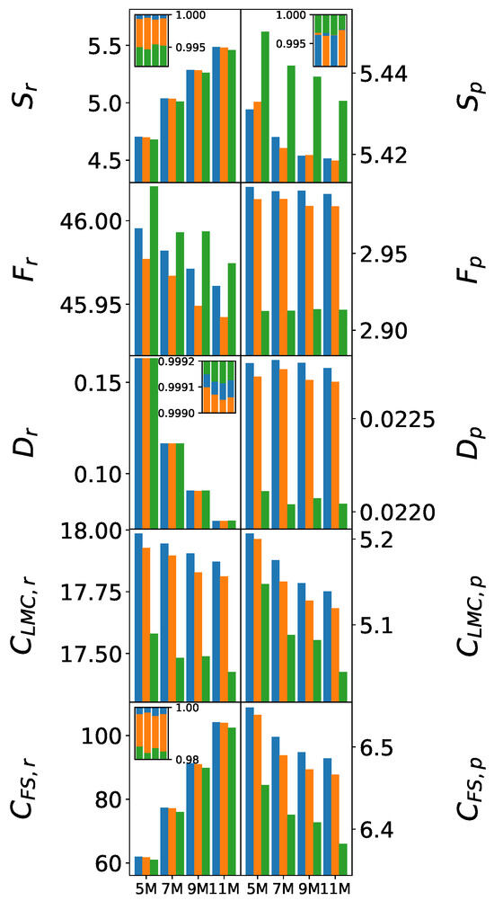 Figure 5 illustrates the systematic evolution of information-theoretic measures with increasing cluster size, highlighting how force field differences scale toward bulk behavior. Only mean values are shown, as the statistical test outcomes for the 7 M and 9 M clusters closely mirror those of the 5 M cluster. For , , , and , the values are additionally normalized and displayed in inset plots to enable adequate visual comparison.