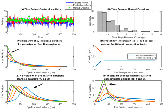 Competition model. (A) Simulation of the saccade and eye fixation network activity. The crossing points in which the saccade network presents more activity than the eye fixation network are labeled. (B) Frequency histogram of the time between two crossings of activity higher in the saccade than in the eye fixation network. (C) Probability density function (PDF) of a geometric distribution following Equation (1). The arrow indicates the PDF with the higher ps value. (D) Change in ps′(t) values: probability that the saccade network wins the competition in a given time bin, taking into account the time elapsed from the previous saccade (Equation (2)); (1 ps) represents the probability that the eye fixation network wins the competition. (E) Frequency histogram of fixation duration times as computed from Equation (3), obtained by changing the geometric distribution by modulating the A parameter, and consequently the ps′(t) (Equation (2)). The arrow indicates the PDF with the lower A value. (F) Same as (E) but changing asymptotic ps values and keeping fixed the A parameter. The arrow indicates the PDF with the higher ps value.