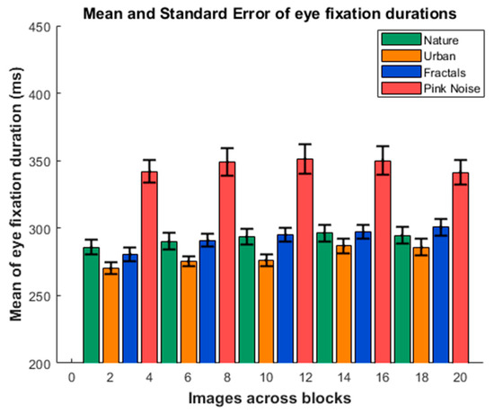 Mean of eye fixation durations. The image shows the mean and standard error of the eye fixation duration across the five consecutive blocks for the four presented type of images (nature, urban, fractal, and pink noise).