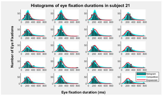 The following supporting information can be downloaded at: https://www.mdpi.com/article/10.3390/e27101079/s1, Supplementary Figures S1 and S2: Competition and exGaussian modelling of eye fixation durations histograms. Supplementary Figure S3: Akaike Information Criteria (AIC). Supplementary Figure S4: Shannon Entropy of eye fixation durations modifying the bins width. Supplementary Table S1: Post Hoc Comparisons—block ✻ images. Matlab code for accessing and analyzing the data.