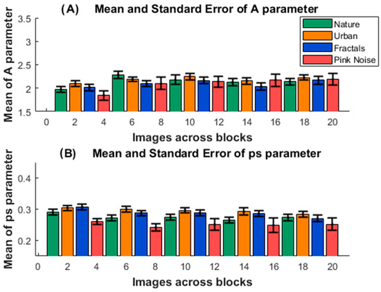 A and ps values of the competition model. (A). The image shows the mean and standard error of the A (A) and ps (B) parameters of the competition model, for the five consecutive blocks and for the four presented type of images (nature, urban, fractal and pink noise).