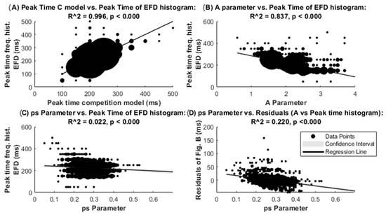 Figure 5A shows the robust regression between the time to reach the peak time of the C model and the peak of the EFD histograms. The high R2 indicates good adjustment between the model and the empirical data for peak times. Figure 5B,C show the linear robust regression of the A and ps parameter with the peak time of the EFD histograms, respectively. The much higher R2 for the regression of the A parameter suggests that it is the A parameter of the C model which defines the refractory period of the EFD histograms. However, the role of the ps parameter in defining the peak time of the EFD histogram, in a more limited manner, is observed by the statistical significance of the A parameter vs. peak time of the EFD histogram residuals (obtained from Figure 5B), when regressed with the ps parameter (Figure 5D). The latter results suggest that the empirical peak time of the EFD histogram depends also on the parameter ps, advancing the peak time when ps is high, and inducing a time delay when the ps parameter is low.