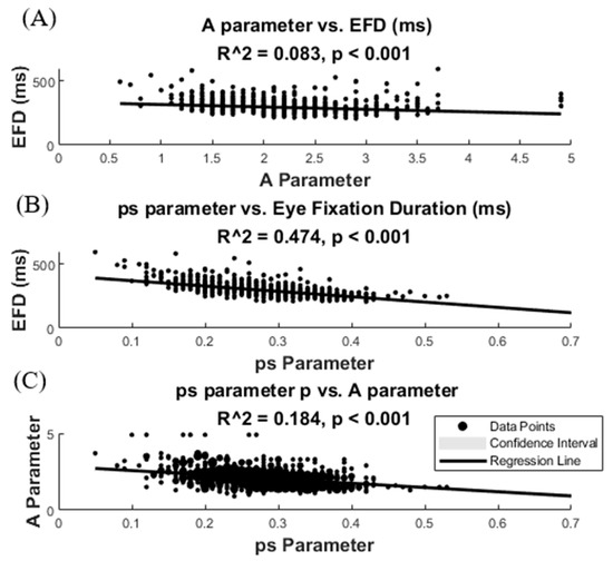 Robust regression of the mean of eye fixation duration (EFD) with A and ps parameters of the competition model. Eye fixation duration regression with the A (A) and ps (B) parameters. (C) displays the regression between parameters A and ps. Confidence intervals are barely visible due to the high number of represented points (900).