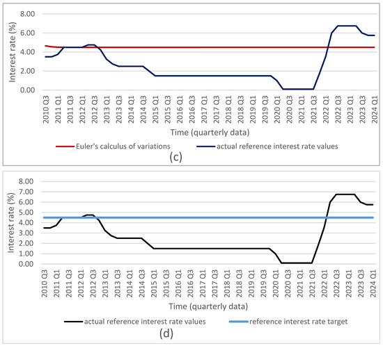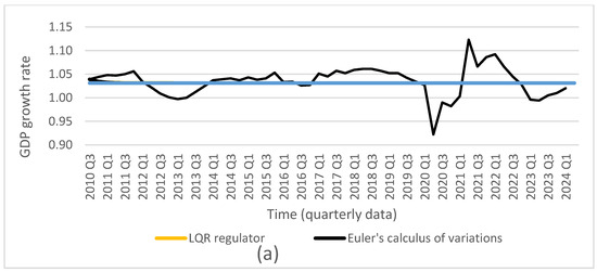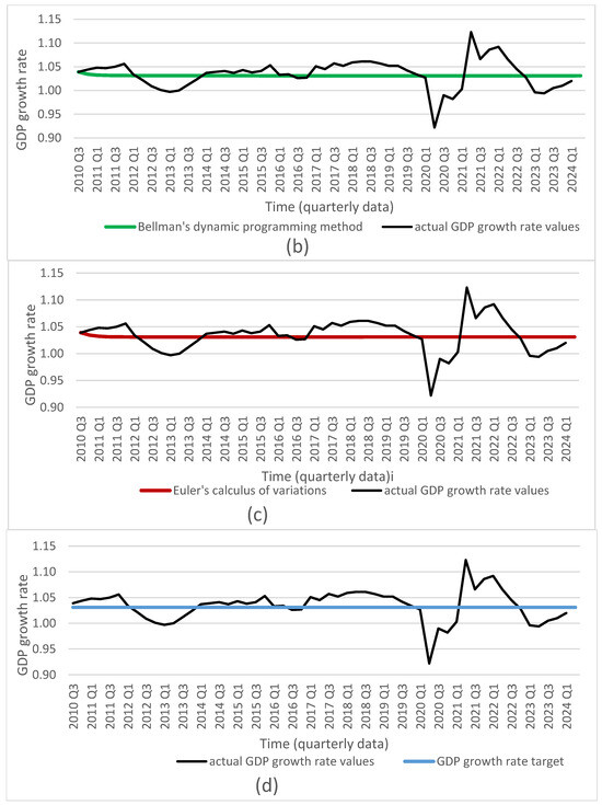Comparison of GDP growth rate: (source: Central Statistical Office of Poland) with results from (a) LQR (own calculations); (b) Bellman’s dynamic programming method (own calculations); (c) Euler’s calculus of variations (own calculations); and (d) target values (source: Central Statistical Office of Poland).