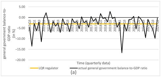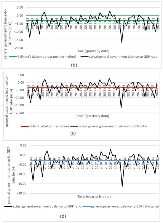 Comparison of actual general government balance-to-GDP ratio (source: Central Statistical Office of Poland) with results from (a) LQR (own calculations); (b) Bellman’s dynamic programming method (own calculations); (c) Euler’s calculus of variations (own calculations); and (d) target values (source: Central Statistical Office of Poland).