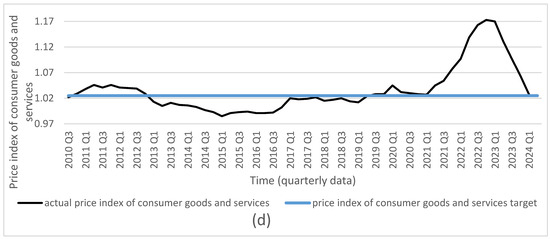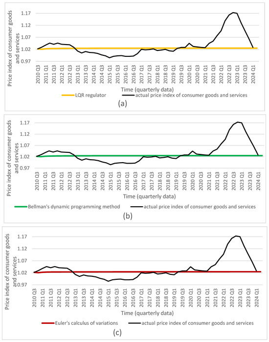 Comparison of actual price index of consumer goods and services (source: Central Statistical Office of Poland) with results from (a) LQR (own calculations); (b) Bellman’s dynamic programming method (own calculations); (c) Euler’s calculus of variations (own calculations); and (d) target values (source: Central Statistical Office of Poland).