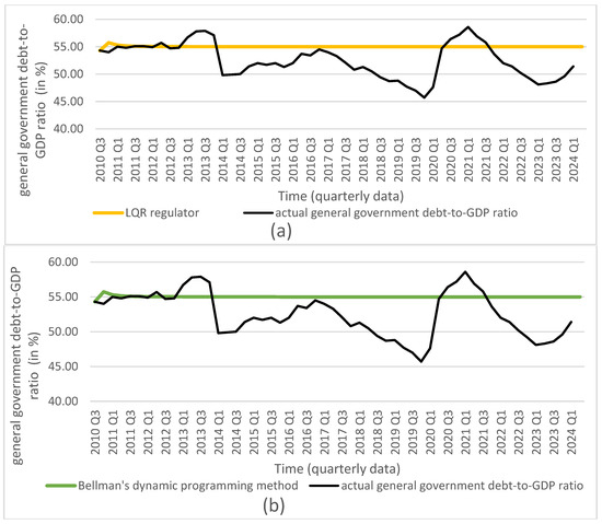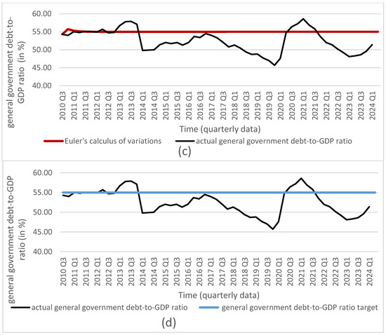 Comparison of general government debt-to-GDP ratio (source: Central Statistical Office of Poland) with results from (a) LQR (own calculations); (b) Bellman’s dynamic programming method (own calculations); (c) Euler’s calculus of variations (own calculations); and (d) target values (source: Central Statistical Office of Poland).
