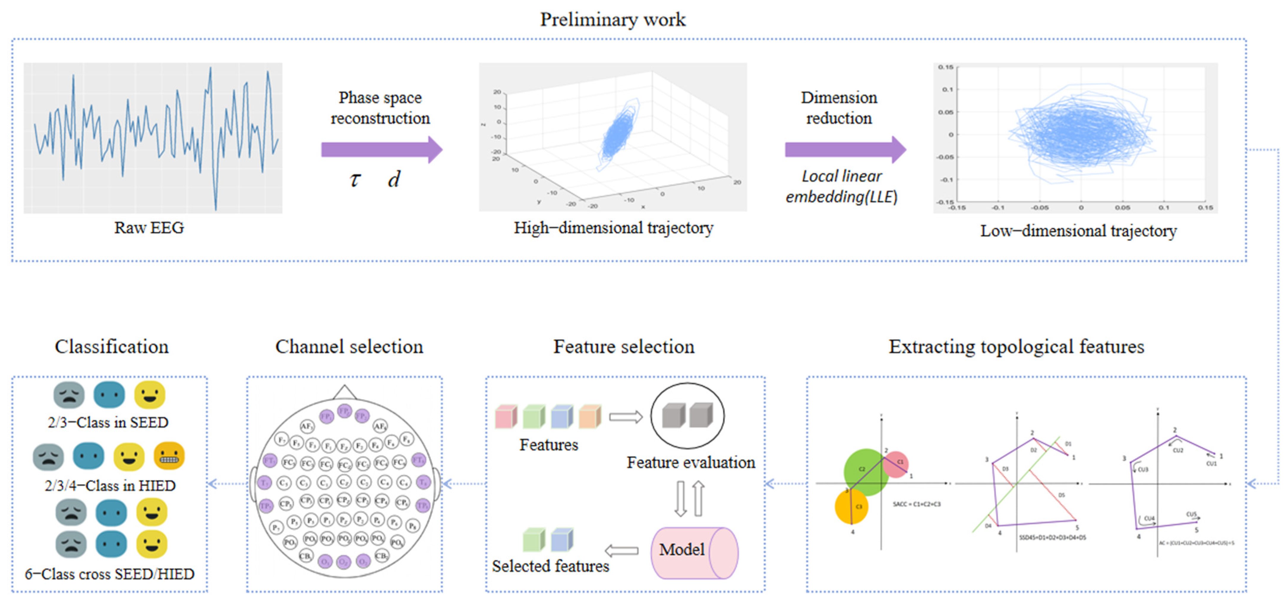 - We extract 16 topological features based on consideration of three perspectives (area of the trajectory, degree of distortion of trajectory edge, and distance of the trajectory point from the coordinate center), which reflects the dynamic changes and complex structure of the EEG signals.