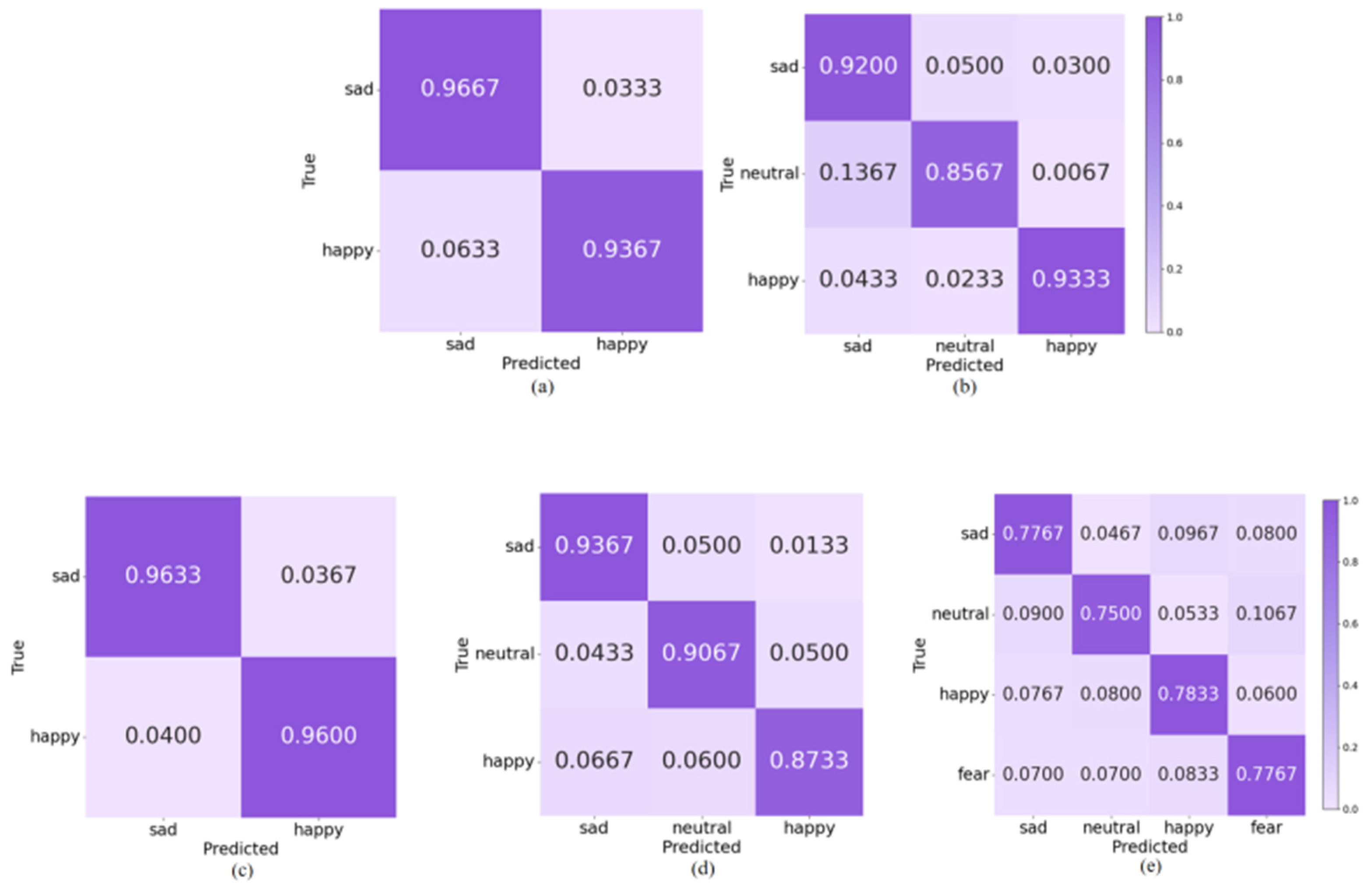 2-Class (Happy/Sad) | 3-Class (Happy/Neutral/Sad) | 2-Class (Happy/Sad) | 3-Class (Happy/Neutral/Sad) | 4-Class (Happy/Neutral/Sad/Afraid) | |