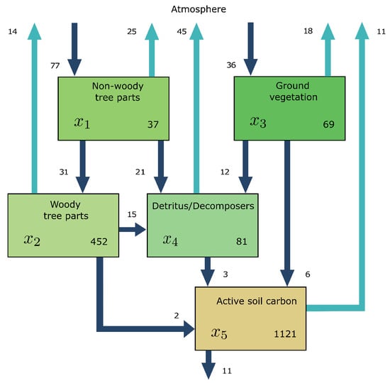 - Eriksson, E. Compartment Models and Reservoir Theory. Annu. Rev. Ecol. Syst. 1971, 2, 67–84. [Google Scholar] [CrossRef]