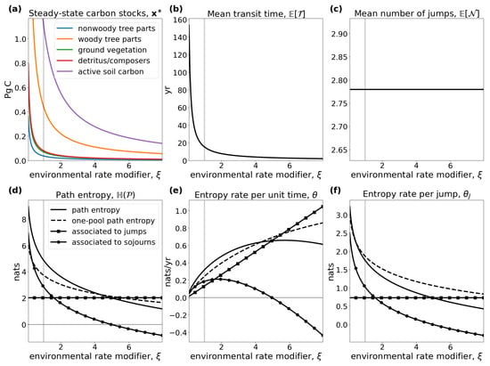 We are interested in the uncertainty/information content of the path of a single particle. Along the lines of Albert [35], we construct a space ℘ that contains all possible paths that can be taken by a particle that runs through the system until it leaves. Let denote the space of paths that visit n compartments/states before ending up in the environmental compartment/absorbing state . By , we denote the space of all eventually absorbed paths. Note that, since is invertible, a path through the system is finite with probability 1. Let l denote the Lebesgue measure on and c the counting measure on S. Furthermore, let be the -finite product measure on . It is defined by . Almost all sample functions of can be represented as a point ([36] Chapter VI). Consequently, we can represent X by a finite-length path for some , where .