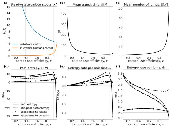 The focus on a single particle gives our entropies microscopic system properties and consequently distinguishes our approach from the theory of maximum caliber (MaxCal) [24,25], where path entropy is interpreted as a macroscopic system property of bulk material. Furthermore, our approach differs from the thermodynamic approach to entropy, which has been developed by other authors studying energy transfers and reversibility in thermodynamic systems [8,26,27,28]. While the probabilistic interpretation of thermodynamic entropy is related to the uncertainty of the location of a typical particle at a specific point in time, the newly introduced path entropy considers all locations of a typical particle at all times while it is part of the system. A first application of our information theoretical entropy concept to compartmental systems allows us to reveal hidden inherent properties of complex systems such as the carbon cycle, from the microbial to the global scale, e.g., allowing us to partly explain why there is a large diversity of soil carbon models, while there is more consensus on how to model carbon uptake by photosynthesis.