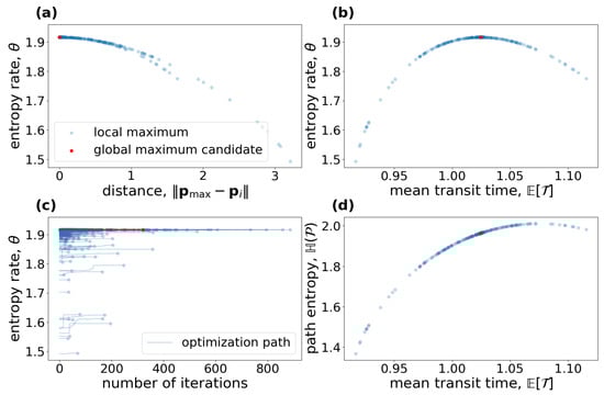 For these entropy rates to be useful in the process of model selection, it is important that they guarantee the existence of a unique maximum entropy model in case of a convex parameter space, which is not obvious from their definitions. The classical entropy rate of a stochastic process as defined in (Cover and Thomas [29] Sect. 4.1) has this property, and we prove in Appendix A that , where the stationary process on the space describes the infinite journey of a typical particle. It is the sequence of visited compartments with the associated sojourn times of a single particle through the system with immediate jumps back into the system when leaving it. By Equations (41) and (42), the average time between two jumps is . If we divide the entropy rate per jump by it, we obtain the entropy rate per unit time. Hence,