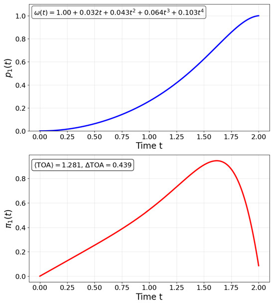 In Figure 2, we optimize a time-dependent control protocol driving a two-level quantum system governed by the Hamiltonian (7). Starting from the initial state , our goal is to deterministically reach the target state at time T, while ensuring that the transition probability increases monotonically over time. We construct as a fourth-order polynomial and define a cost function