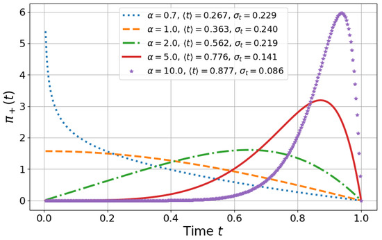 Using Equation (2), we now find , whence , which can be interpreted as the TOA distribution for , see Figure A2. This means that we expect half of the spins to arrive in the state at and the other half at , and thus, the average time of arrival should be the average between these two times, as is consistent with the proposed model. Also, the standard deviation for this two-step model is non-zero, , as expected.