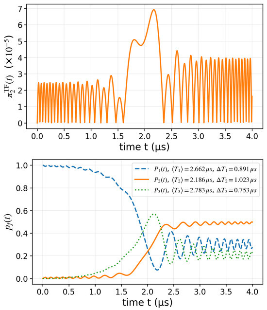 In Figure 4, we consider two constant couplings MHz and a linearly swept detuning from to MHz over . Starting from state , the instantaneous dynamics is solved from the time-dependent Schrödinger equation, yielding population transfer between the three states. The plot on the bottom panel in Figure 4 displays the population dynamics of all three states, , with the corresponding TF mean and standard deviations included in the legend obtained from the respective TF distribution . This illustrates how the TF protocol provides complementary timing information across the whole three-level manifold, beyond what can be inferred from instantaneous populations alone. The plot on the top panel in Figure 4 reports the normalized distribution , showing how the population of state 2 is both gained and lost during the transfer. The fast, high-amplitude oscillations observed in this figure also demonstrate that the transition is rapid and non-adiabatic mentioned above.