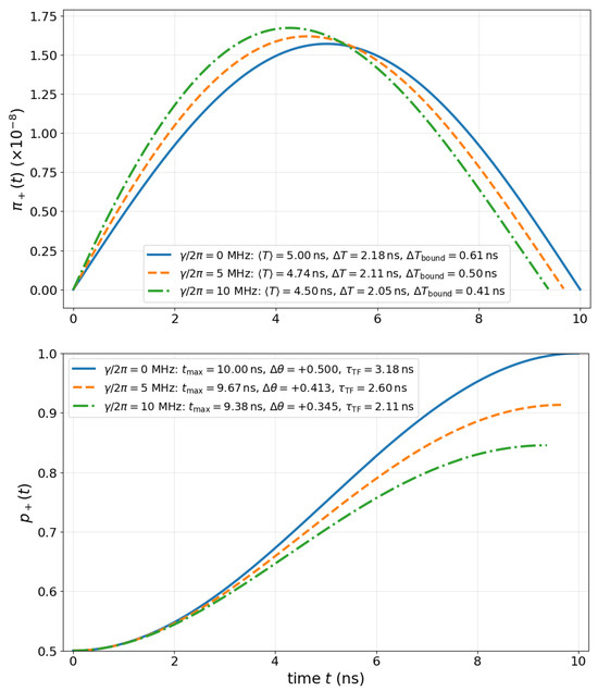 with initial state . The off-diagonal coherence elements in the density matrix decay exponentially, with a characteristic decoherence time [34]. Within our TF distribution framework, the probability of transition from to the orthogonal state evolves as