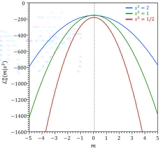 Normal log-likelihood from Equation (5) as a function of the mean of the Gaussian model , shown for three variances: , , and . The data are sampled from a normal distribution with , , and sample size . The vertical dashed gray line indicates the value of m that maximizes the log-likelihood.