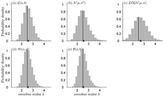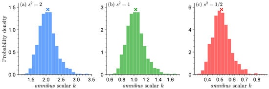 The omnibus scalar k is reminiscent of a learning rate in a power likelihood function, where ’learning rate’ refers to the extent to which the data influence posterior updating. A value of downweights the data and reduces sensitivity to outliers, while increases the influence of the data on the posterior distribution. To provide a deeper intuition of the advantages of a power likelihood, we revisit example 1 in Section 3. Suppose that we inadvertently assumed that (blue line in Figure 2) and the normal distribution model is misspecified. Our estimate of the (naive) variance of will be , while the true variance of is or . With the omnibus scalar, the sensitivity and variability matrices of are equal to and , respectively (see Appendix C). For , we have and . The information identity holds if , yielding, . At this value of k, the naive variance of is or , which is the correct variance of as . Thus, the idea behind the omnibus scalar k is to choose its value such that the powered likelihood satisfies the information identity . As a result, the naive posterior parameter distribution under coincides with the sandwich distribution of the original likelihood . This omnibus correction yields the correct variance-covariance matrix for the estimator .