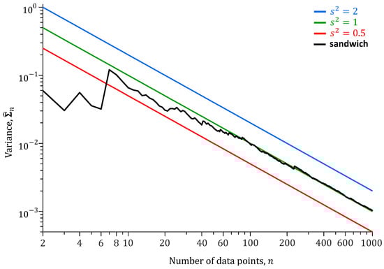 For the other two models with (red line) and (blue line) , and consequently the naive variance will underestimate and overestimate, respectively, the actual uncertainty of m. Upon misspecification, the sandwich variance equals the correct variance ( of m. This estimator does not require prior knowledge of as the matrices and are replaced by their sample estimates, and , evaluated at .