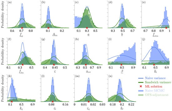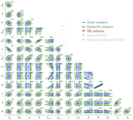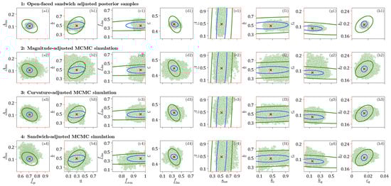 This a posteriori correction method is computationally appealing, as it does not require additional evaluations of the likelihood function . However, the OFS-adjusted posterior samples may not accurately represent the true sandwich parameter distribution, particularly if the adjustment matrix is not constant over the region of in which there is sandwich parameter uncertainty. However, this assumption is not unique to curvature-based methods. What is specific to such methods is the nonuniqueness of the matrix square roots and when the sensitivity and variability matrices and are not positive semi-definite. This can occur if the quadratic approximation of via the second-order Taylor expansion at does not adequately describe the actual curvature of the log-likelihood function. In such cases, and may not be symmetric. Moreover, under certain conditions, these matrices may be ill-conditioned or nearly singular. This may arise when two or more parameters exhibit strong linear dependence, when parameters have very different magnitudes, and/or when the sample size n is small. Ill-conditioning can also be introduced as an artifact of numerical approximation, particularly when finite differences are used to estimate the first- and second-order partial derivatives of with respect to . Floating-point arithmetic can lead to numerical instability due to rounding errors and subtractive cancellation when evaluating small differences between almost equal numbers. This will distort the computation of and .