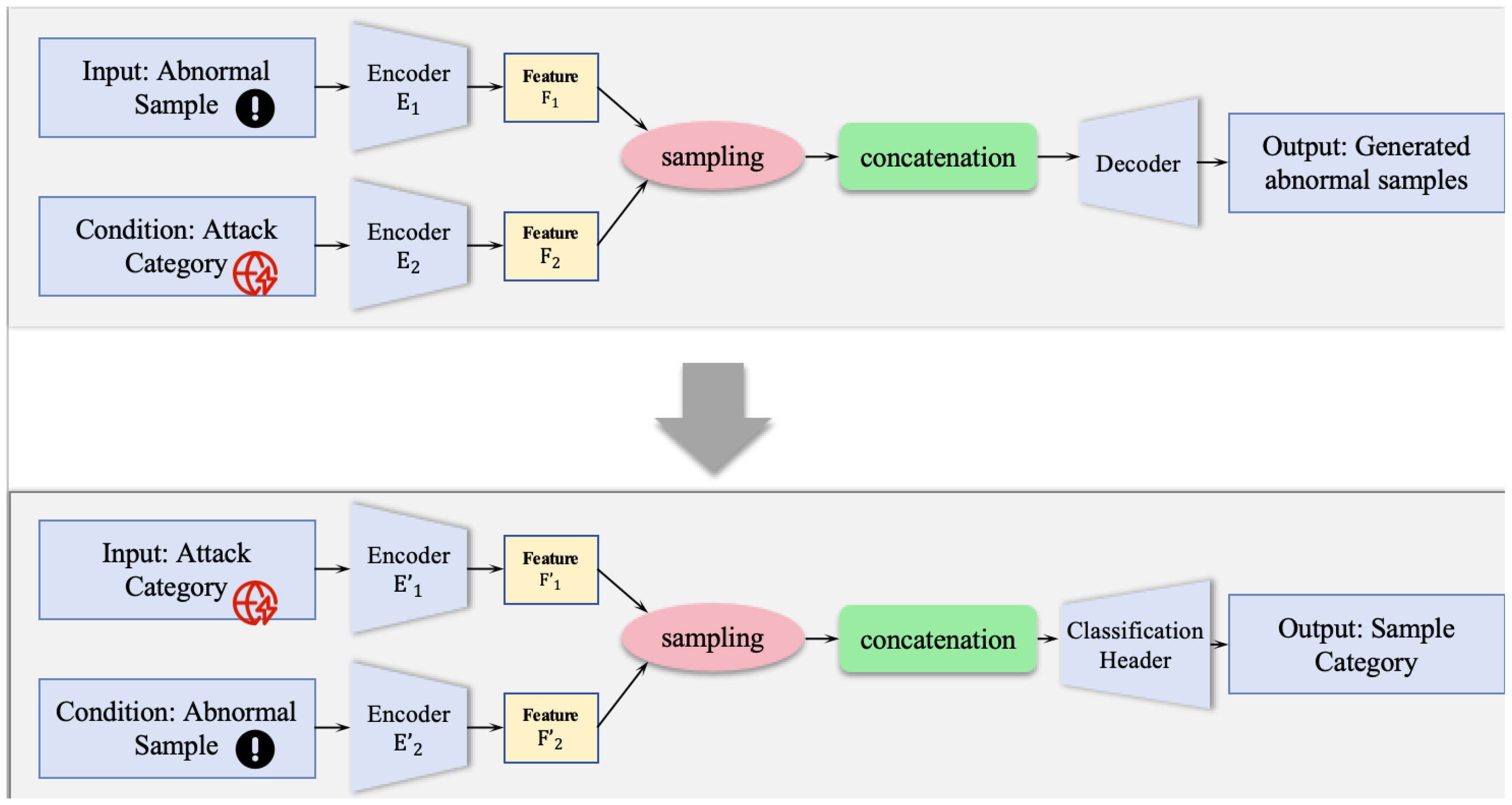 - We propose a data augmentation scheme based on a Conditional Variational Autoencoder (CVAE), namely, the DA-CVAE model. This model leverages the attack category as a condition to directionally generate high-quality and diverse synthetic samples for minority classes within the dataset. Consequently, it effectively counteracts the training bias induced by the severe class imbalance, a common issue in such data.