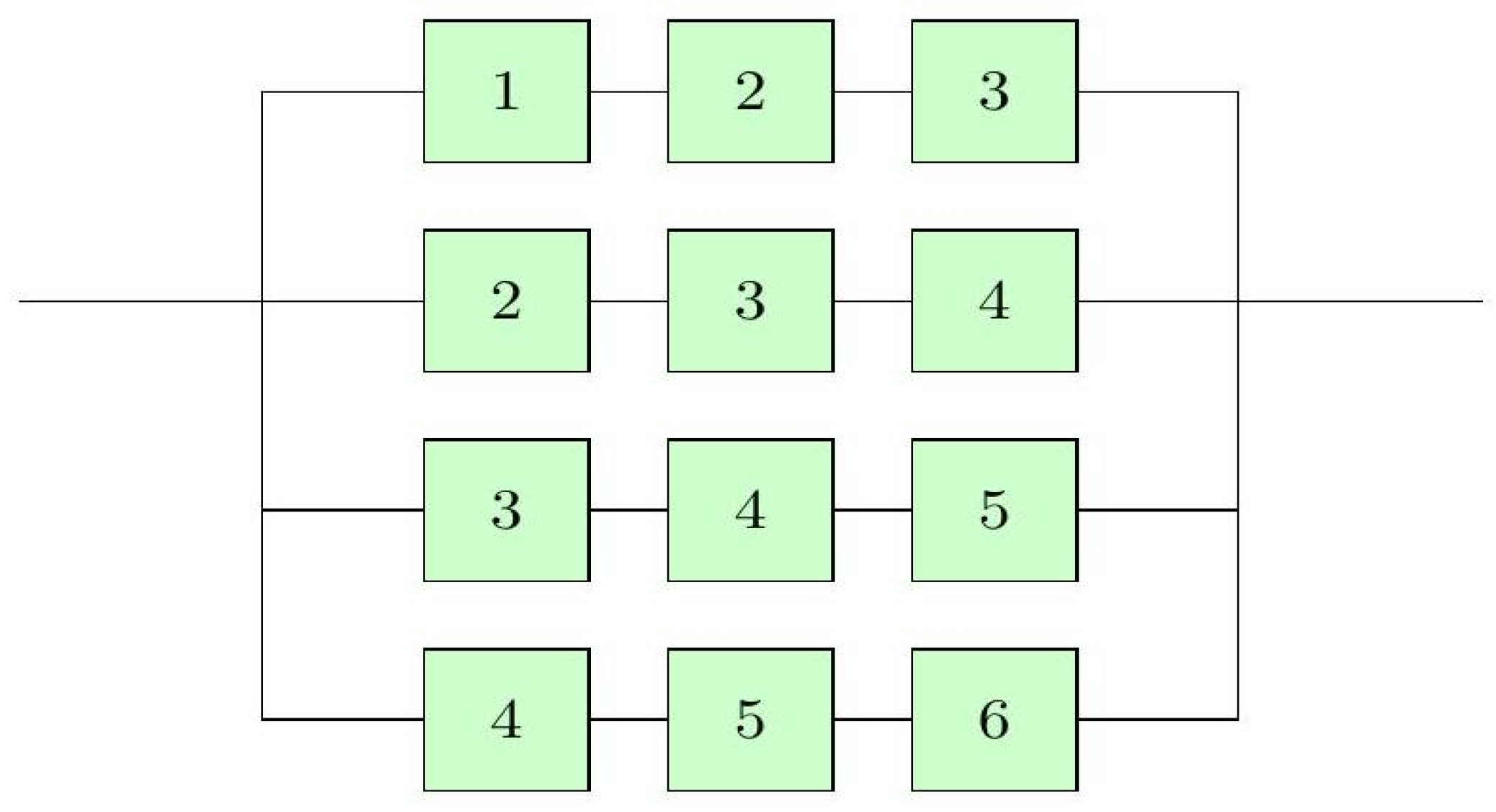 n parallel parking spaces designed for standard-sized vehicles; a bus, due to its larger dimensions, requires two contiguous spaces. The parking system is operational if at least two adjacent spaces are available, which corresponds to a linear consecutive 2-out-of-