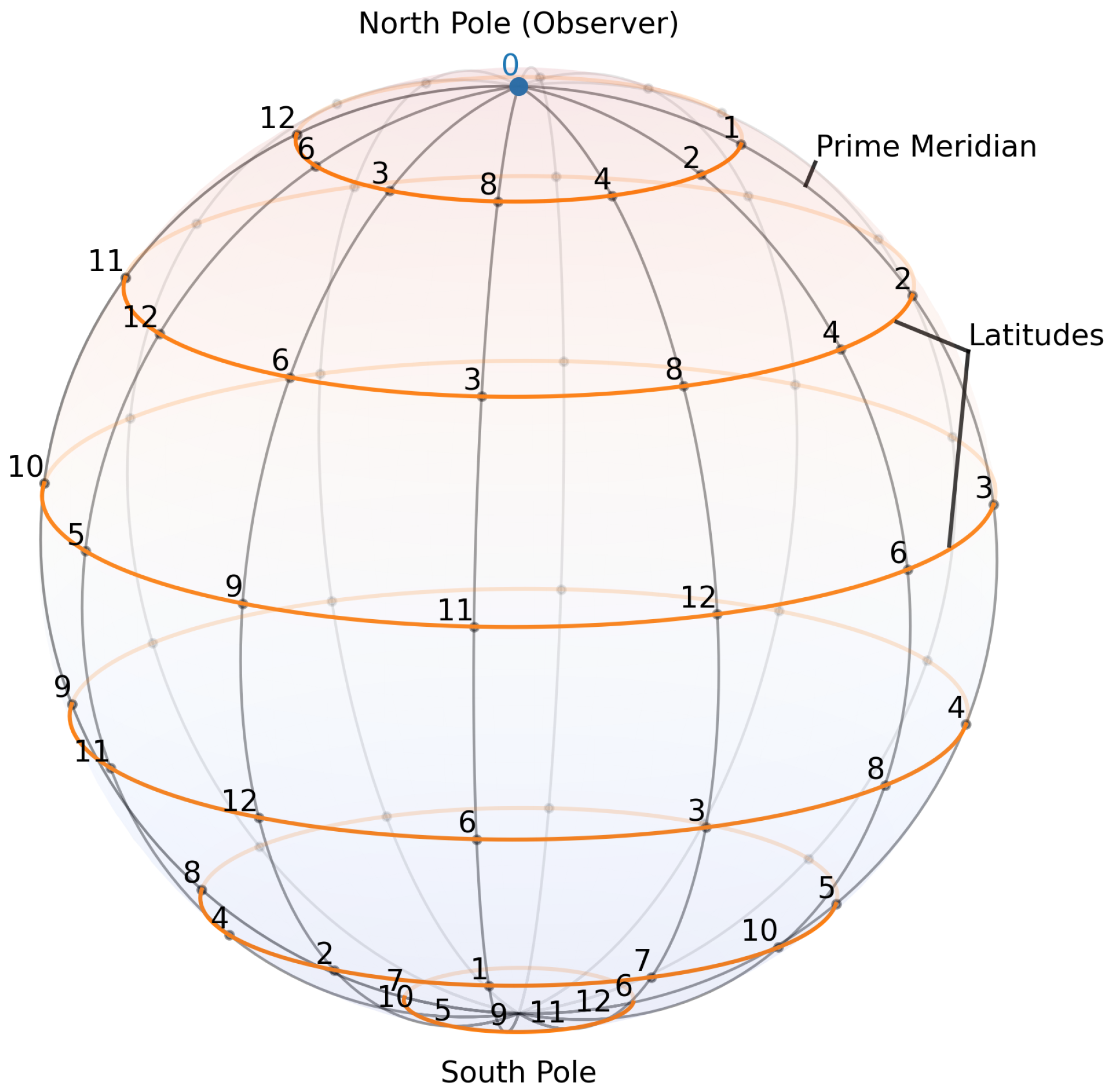 - Relative frames and boost parameter. Let denote a frame of reference in , where g is a primitive root generating multiplicative symmetry. Two observers with generators and differ by a latitudinal step . Define the rapidity-like parameter
