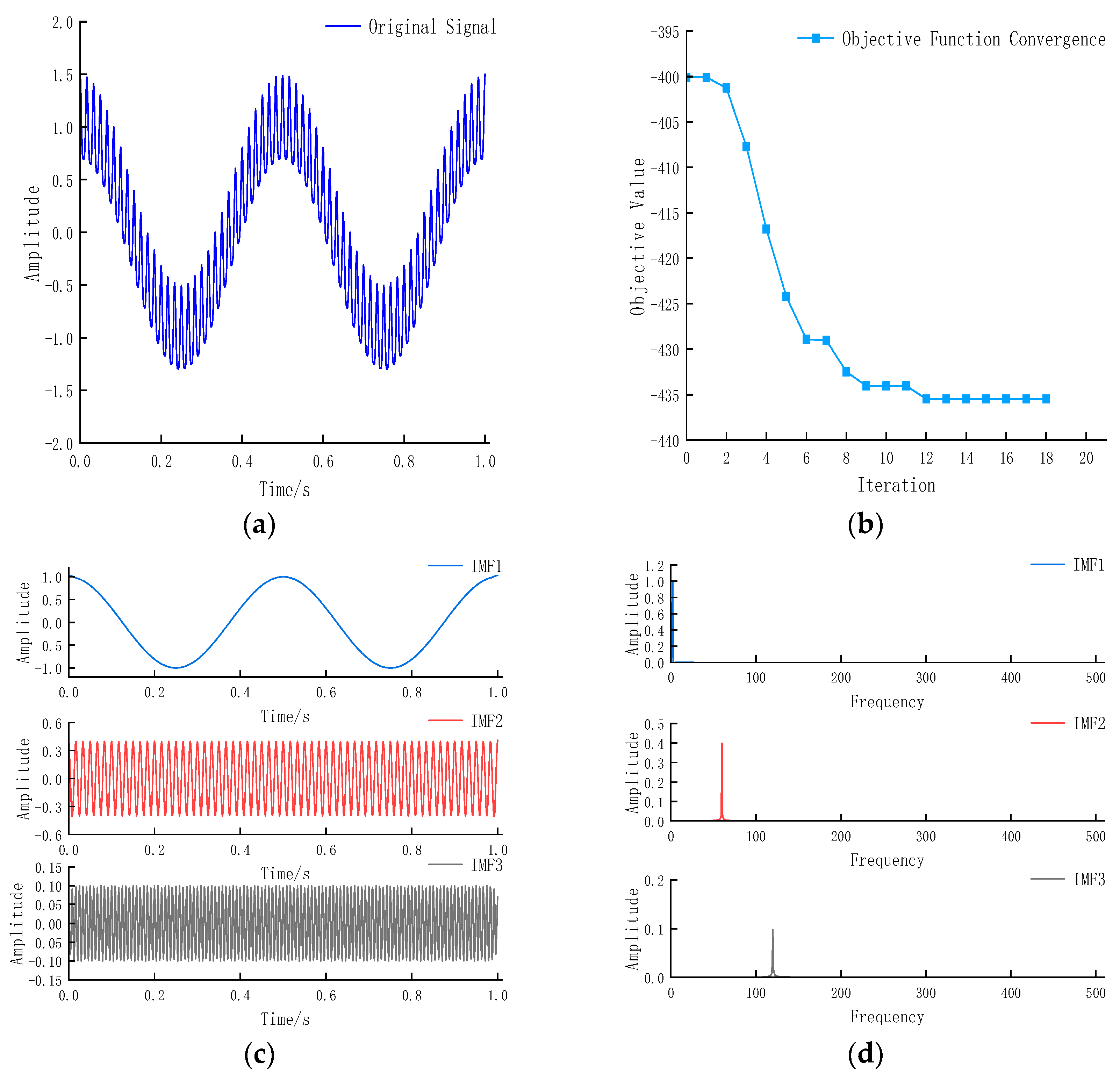 The optimization search for the parameters of Equation (25) yielded the optimal VMD parameter combination [K, α] = [5, 438]. The convergence process of the objective function is shown in