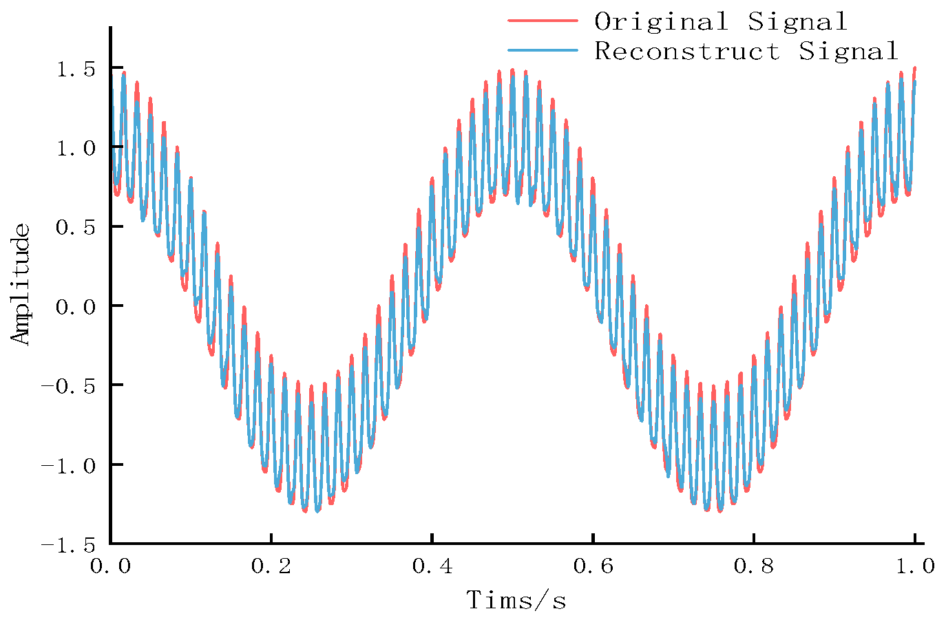 The DHTPSO-VMD method achieves an SNR of 35.6172 dB, which is higher than the traditional EMD (32.9830 dB) and superior to GWO-VMD (35.4270 dB), SABO-VMD (35.1101 dB), and PSO-VMD (34.4351 dB). This demonstrates its enhanced ability to preserve effective components of the original signal while suppressing noise. In terms of MAE, DHTPSO-VMD achieves the lowest value (4.287 × 10−3), representing reductions of 15.97%, 13.41%, and 10.16% compared to EMD (5.102 × 10−3), PSO-VMD (4.951 × 10−3), and SABO-VMD (4.772 × 10−3), respectively. Furthermore, DHTPSO-VMD also achieves the best MSE performance (30 × 10−6), with reductions of 31.82% and 28.57% compared to EMD (44 × 10−6) and PSO-VMD (42 × 10−6), respectively, demonstrating high reconstruction accuracy and stability.