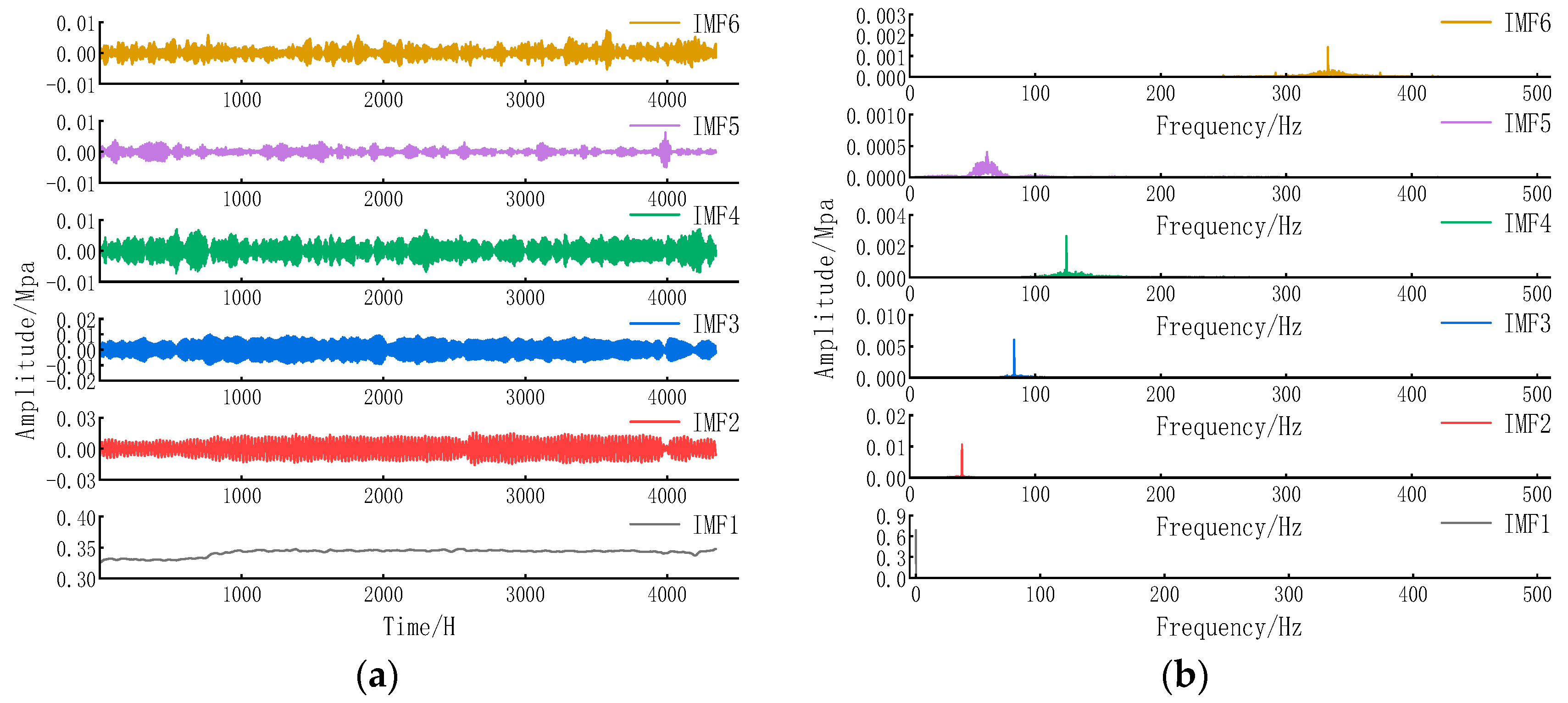 Figure 5a,b show the decomposed IMF signals and their spectra, respectively.
