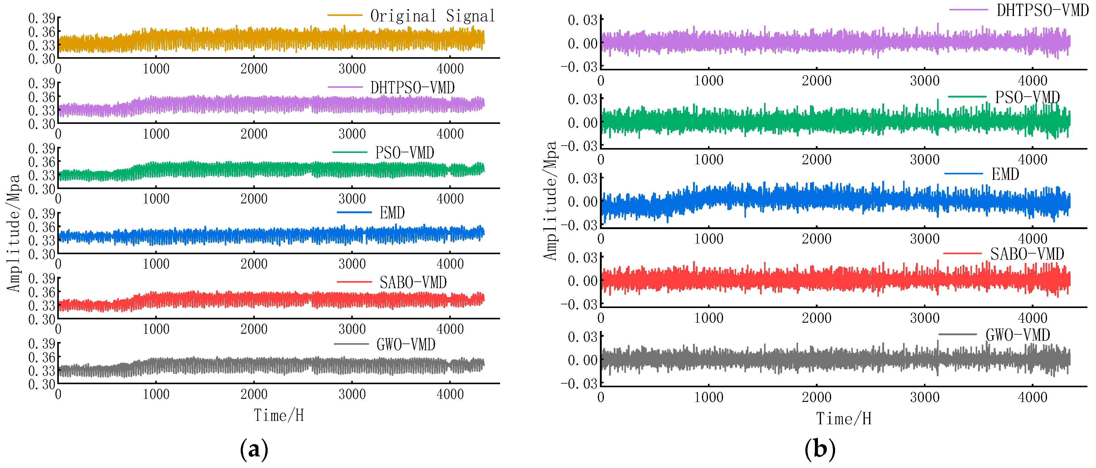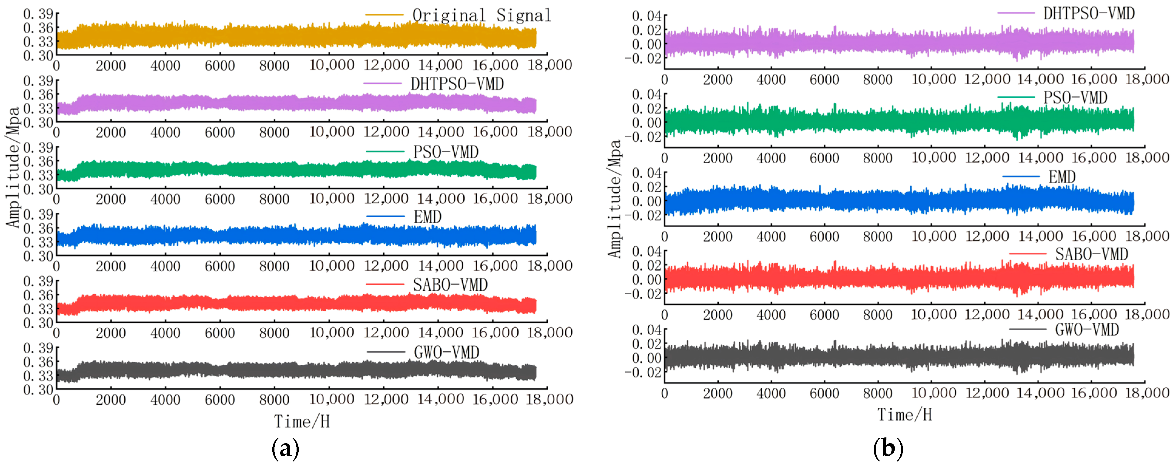 Figure 7a reveals that the signal decomposed using DHTPSO-VMD most closely matches the original signal, with highly consistent fluctuation amplitude and morphology. The EMD method performs poorly, showing differences in both amplitude and pattern compared to the original signal, resulting in lower fitting accuracy. Analysis of the residual signals in
