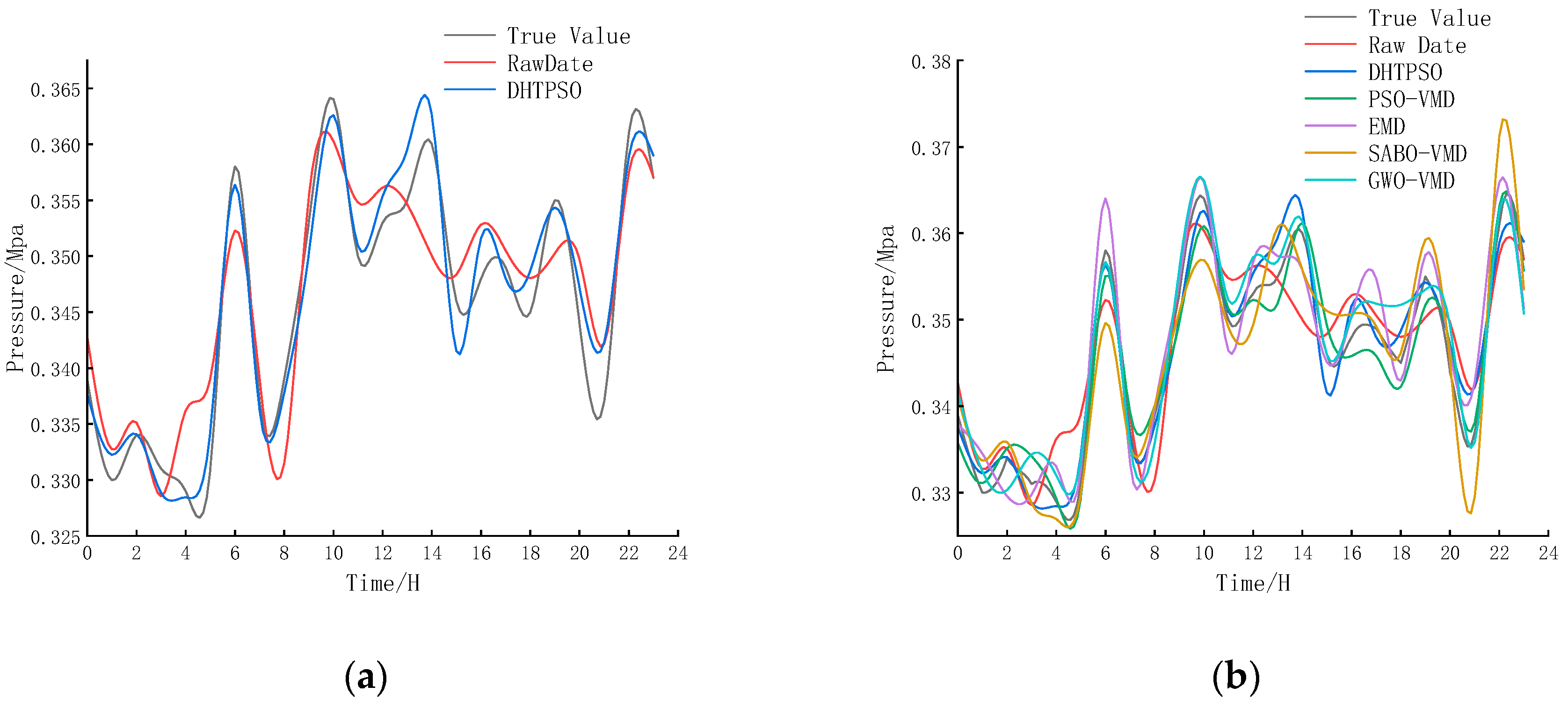 The experimental validation utilized a pressure dataset spanning two consecutive years, comprising 17,544 hourly samples. DHTPSO-VMD was compared with current mainstream methods (including PSO-VMD, EMD, SABO-VMD, and GWO-VMD) on the same dataset. Experimental results indicate that DHTPSO-VMD outperforms all comparative methods across evaluation metrics during the denoising phase. The mean absolute error (MAE) and mean square error (MSE) are also seriously reduced. Data preprocessed with DHTPSO-VMD achieved optimal performance across all three metrics—R2, MAE, and MSE. The R2 value increased to 0.948924, significantly surpassing results obtained without denoising and with other comparative denoising methods. These experiments validate the superiority of the proposed method for denoising water supply network pressure data and highlight its significant engineering application value.