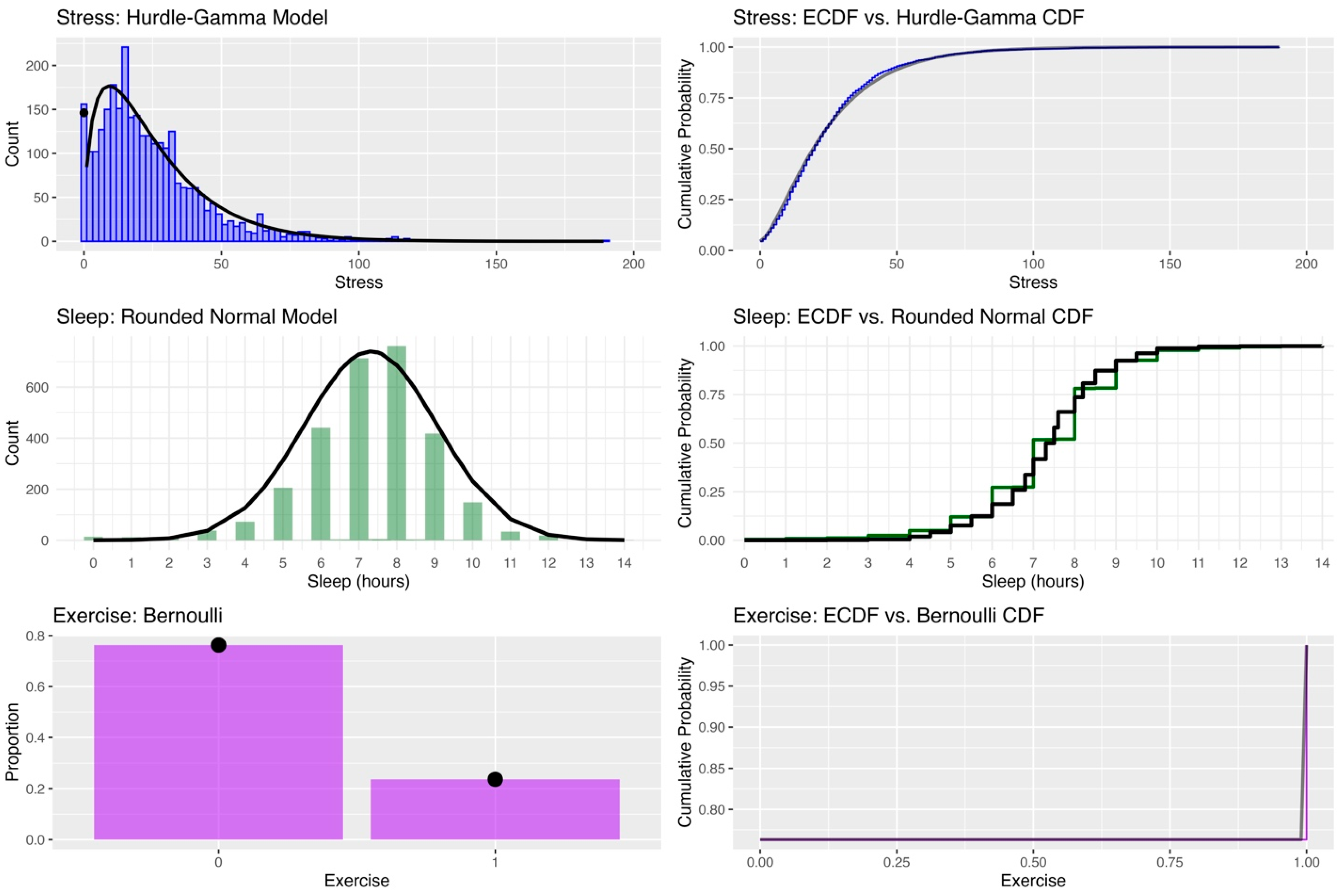 As expected, sleep duration was typically reported in whole-hour values. A rounded normal model was used to reflect this heaping. The fitted normal density provided an adequate approximation of the observed histogram, except for the slight excess of 8-h values, and the predicted cumulative distribution closely followed the ECDF. Finally, daily exercise, recorded as a binary variable (0 = no exercise, 1 = exercised), followed a Bernoulli distribution with a group-level mean near 0.25 (i.e., across the sample, individuals exercised on 25% of the days).