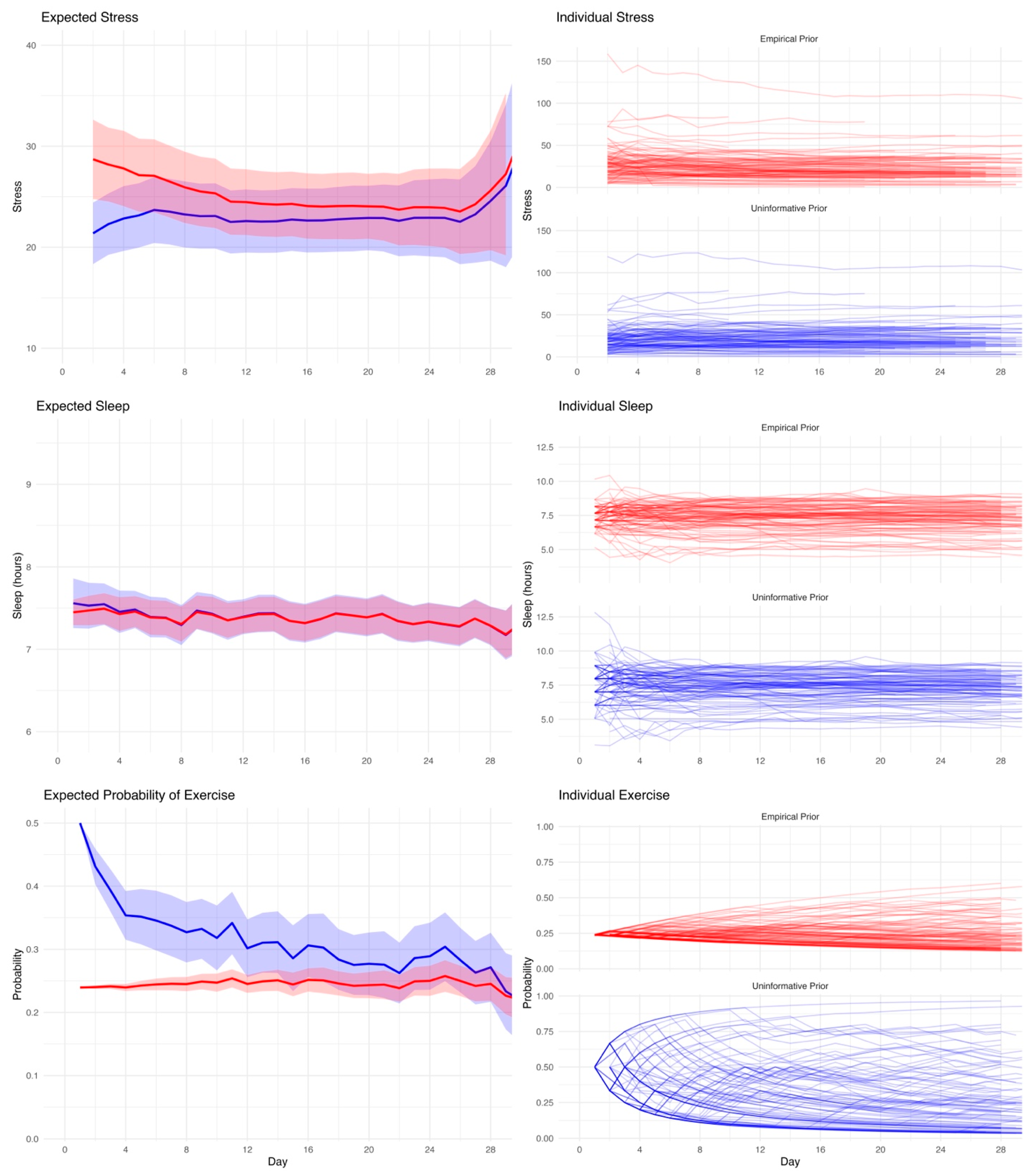 Figure 2). For stress, expectations under empirical priors began higher than those under uninformative priors, but the two trajectories gradually converged over time as individual observations accumulated. Individual variability in stress reporting was considerable, particularly under the empirical prior, where a subset of participants showed persistently elevated expected values.