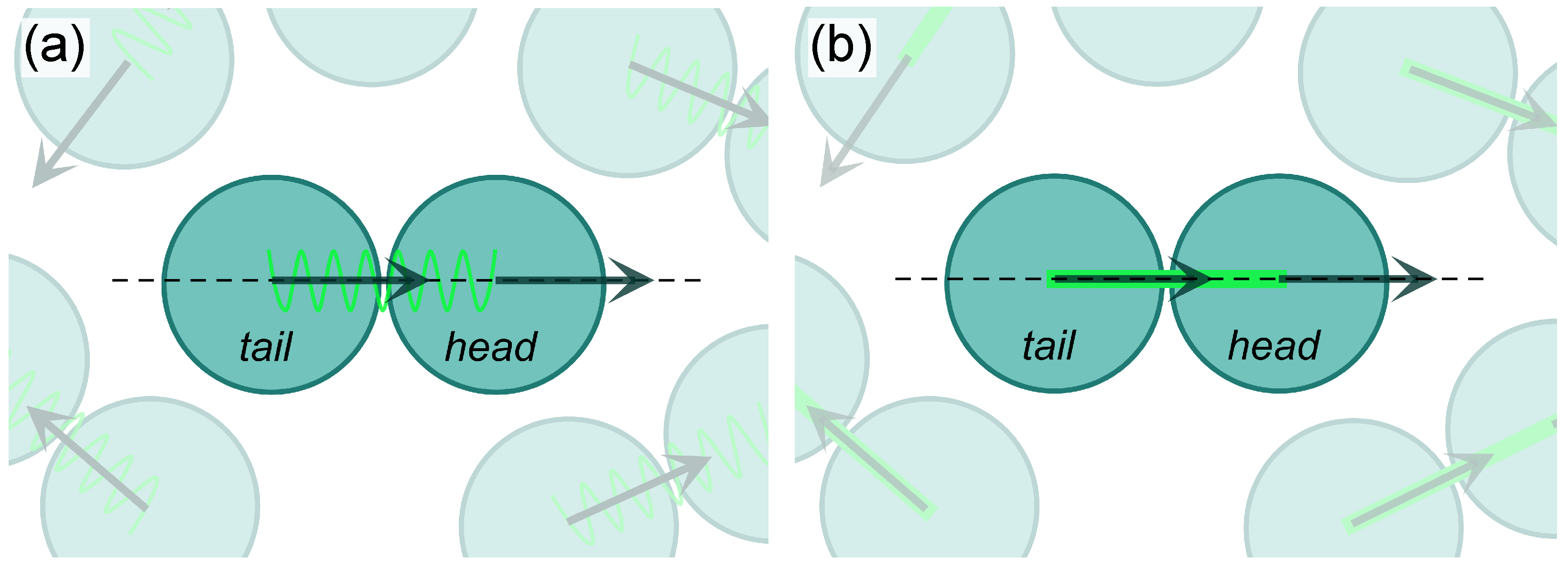 - In the LJ case, we promote bead overlapping; thus, is set as a finite extensible non-linear elastic (FENE) force [76], which at the same time avoids unlimited bead separation (see Figure 1a). In symbols, FENE force is defined aswhere k is an elastic constant, is the maximum distance between beads, and , , with () when the i-the bead is tail (head).