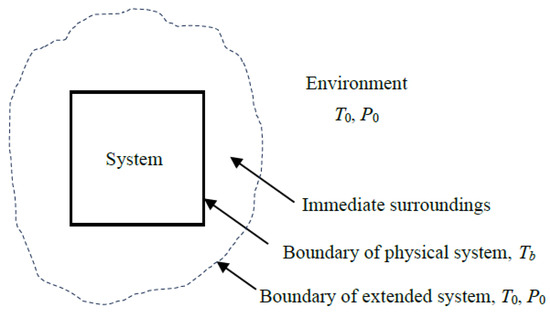 Most differences in defining exergy efficiency stem from how the exergy transfer associated with heat loss and expelled mass is treated—whether it is categorized as exergy loss or exergy destruction. This ambiguity can be resolved by applying the concept of the extended system, consisting of the system and its immediate surroundings where temperature and concentration gradients exist (Figure 1). The extended system includes the temperature and concentration gradient zones, and the boundary temperature, pressure, and concentration values are those of the environment.