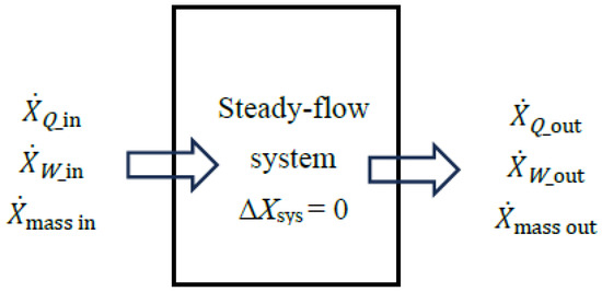 A steady-flow system may involve exergy transfer into or out of the system by heat, work, and mass flow (Figure 2). However, unlike a closed or unsteady-flow system, it cannot involve a change in its exergy content, and thus the term ΔXsys does not appear in exergy–efficiency relations. The sum of exergy transfer into a steady-flow system by heat, work, and mass constitutes exergy expended while the sum of the exergy transfer out of the system by heat, work, and mass constitutes exergy recovered. The difference between the two is exergy destroyed.