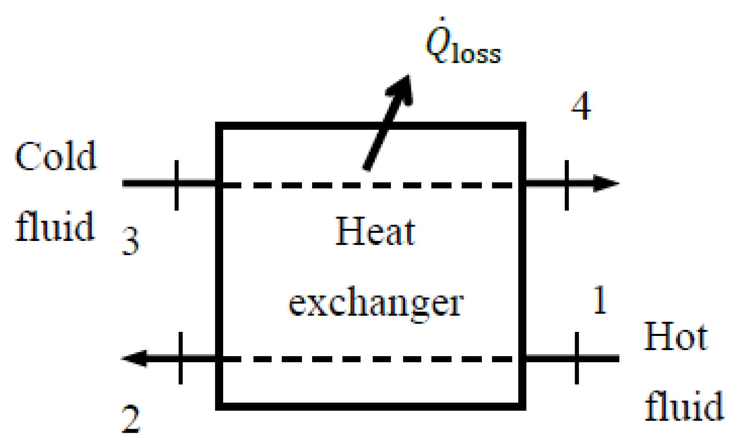 Denoting incoming hot and cold streams as 1 and 3, respectively, and the corresponding outgoing ones as 2 and 4, the exergy efficiency of a heat exchanger can be expressed as follows:
