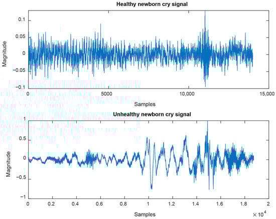 Examples of cry signals are recorded from healthy and unhealthy newborns.